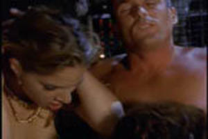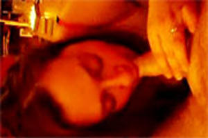 De volslanke slet pijpt zijn harde lul, tot hij zich aftrekt en klaarkomt op haar gezicht. Dan masseert hij met zijn voeten haar tieten die hij neukt en komt nu op haar kale kut klaar, waarna de geile teef zijn anus schoon likt.