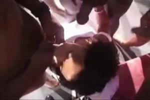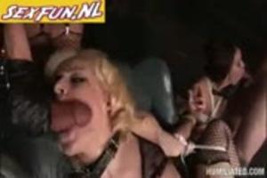 Ze krijgt in deze gangbang haar gezicht vol sperma, ze pijpt en trekt aan de grote lullen tot ze haar gezicht bedekken met een laag sperma.